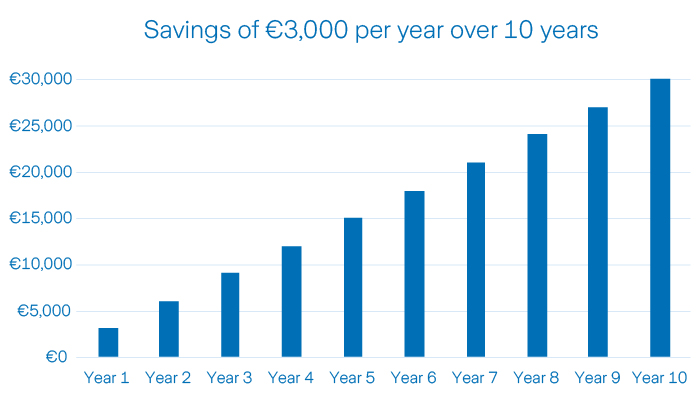 By choosing to invest your yearly gift, it’s possible for the total value to surpass the original investment. Assuming an annual growth rate, your gift of €3,000 per year over 10 years could be worth more than the total amount saved. Investing for growth helps you make the most of every contribution.